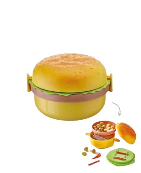 3-layer burger-shaped lunch box with spoon, leak-proof & portable. Perfect for school, office, picnics, and as a birthday return gift. 🍔💖