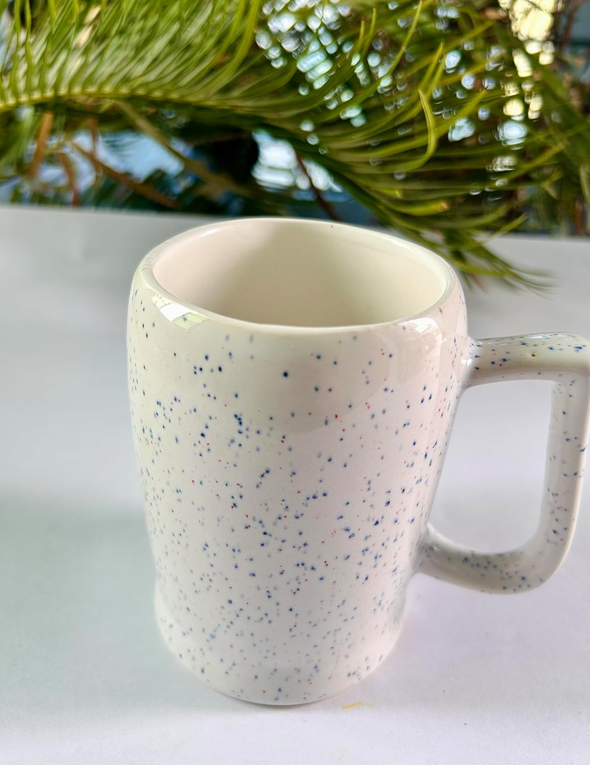The glossy white speckled finish adds an artisanal touch, while the sturdy rectangular handle ensures a firm and comfortable grip. Its spacious design makes it perfect for enjoying coffee, tea, hot chocolate, soups, or any warm beverage.