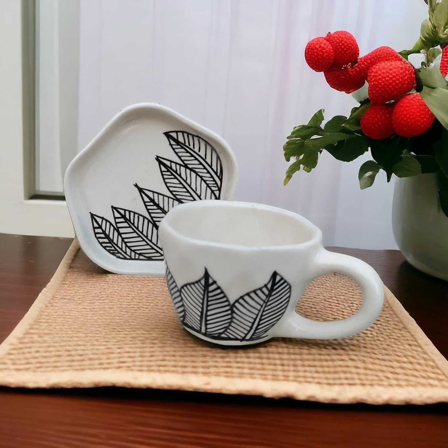 Add a touch of elegance to your tea and coffee time with the Ceramic Coffee Mug with Saucer – Black Leaf Print Edition by Sipistryz. 🌿✨