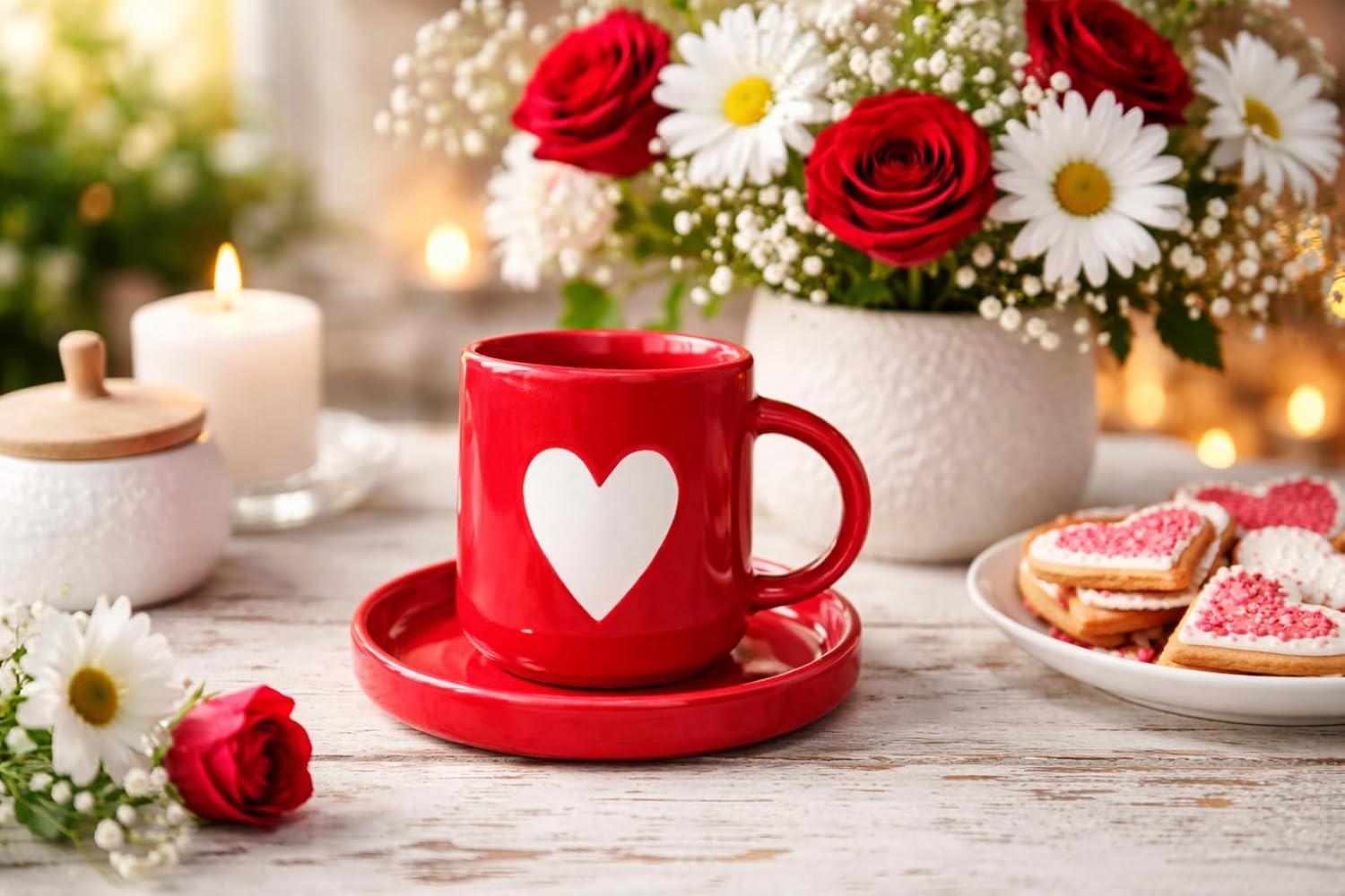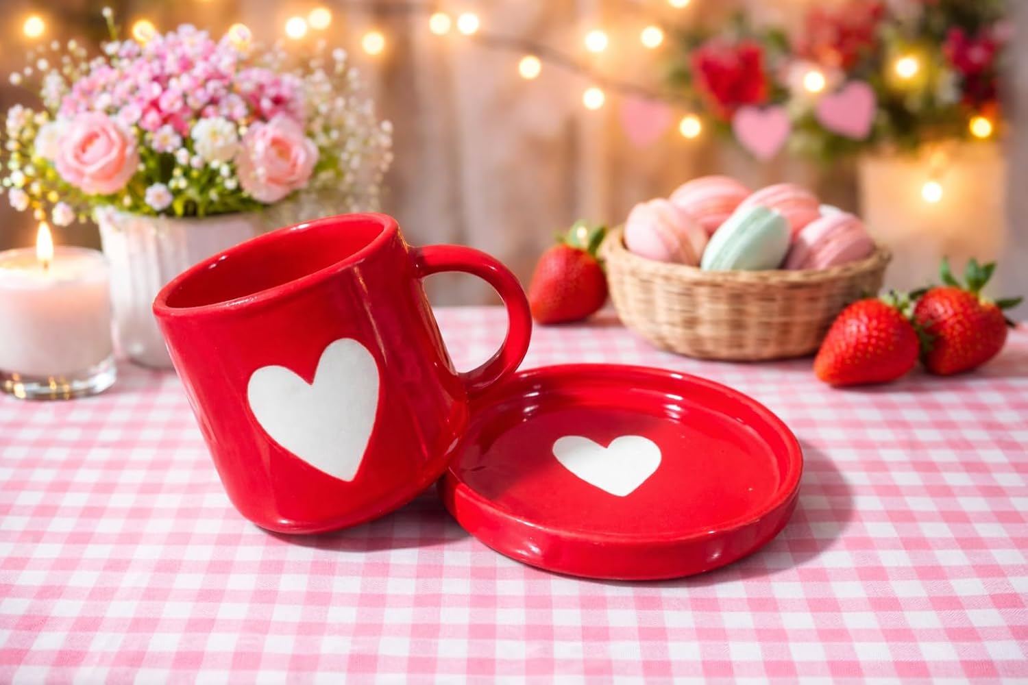 This stunning red ceramic cup and saucer set features a hand-painted white heart motif, symbolizing warmth, love, and connection. Its smooth glossy finish and ergonomic handle make it as functional as it is beautiful, perfect for savoring tea, coffee, milk, or hot chocolate.