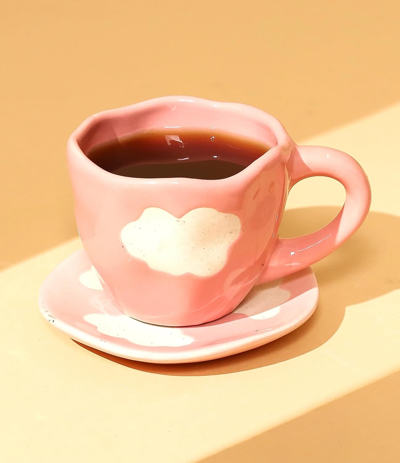 Designed to make every beverage feel magical, this handcrafted pastel-pink mug features a soft cloud-shaped silhouette paired with a matching wavy saucer for an aesthetic and cozy vibe.