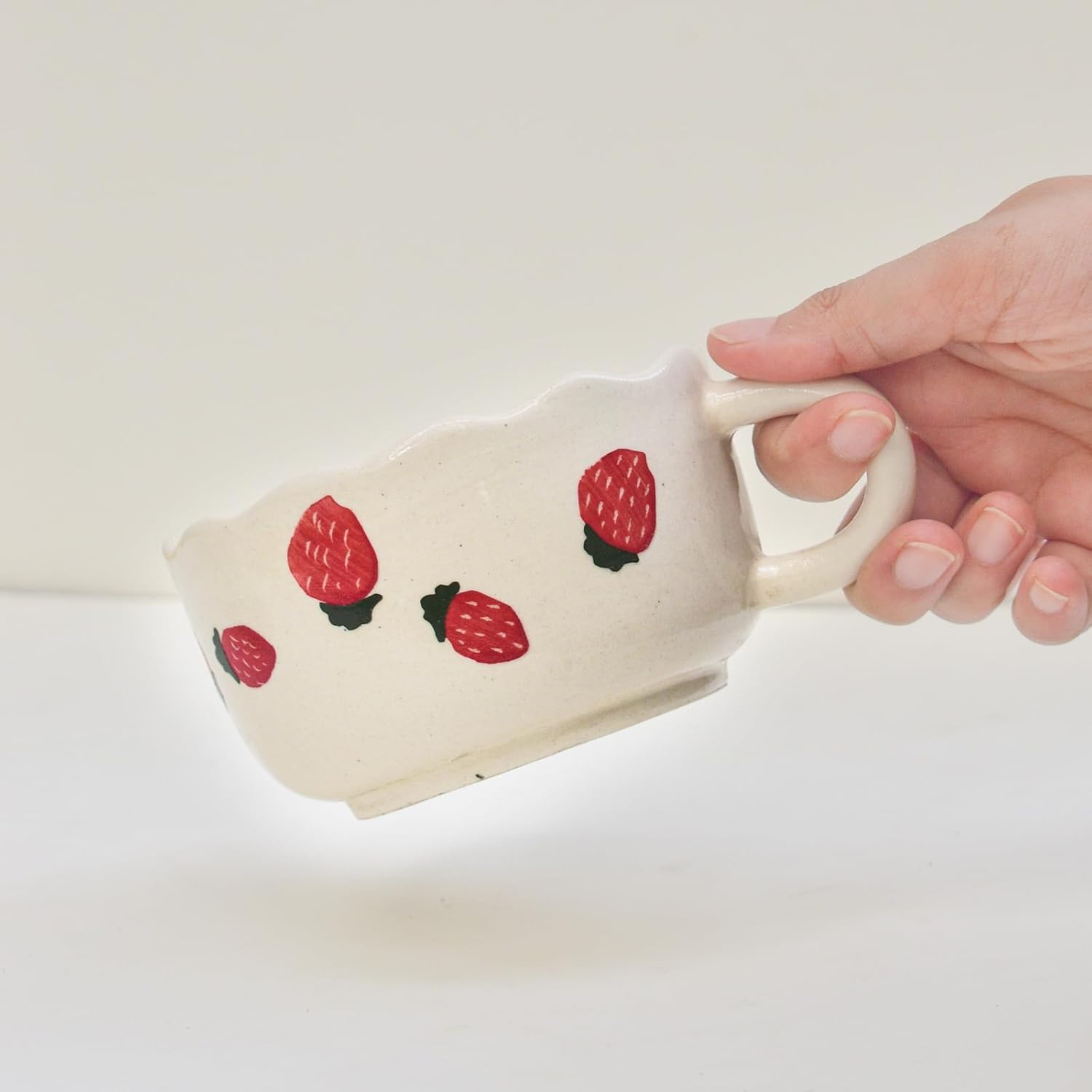 Handcrafted with love, this kawaii-style ceramic mug features an adorable red strawberry print on a smooth off-white base, complete with a scalloped wavy rim and comfortable handle for the perfect cozy grip. Whether itβs your morning cappuccino, evening tea, or a comforting bowl of soup, this aesthetic handmade mug makes every sip a joy.