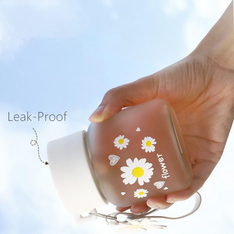 daisy frosted glass water bottle with lid – 300ml cute flower juice jar / hot & cold drinking cup with rope handle for office, home, travel & schoolDaisy Frosted Glass Water Bottle with Lid – 300ML Cute Flower Juice Jar / Hot & Cold Drinking Cup with Rope Handle for Office, Home, Travel & School