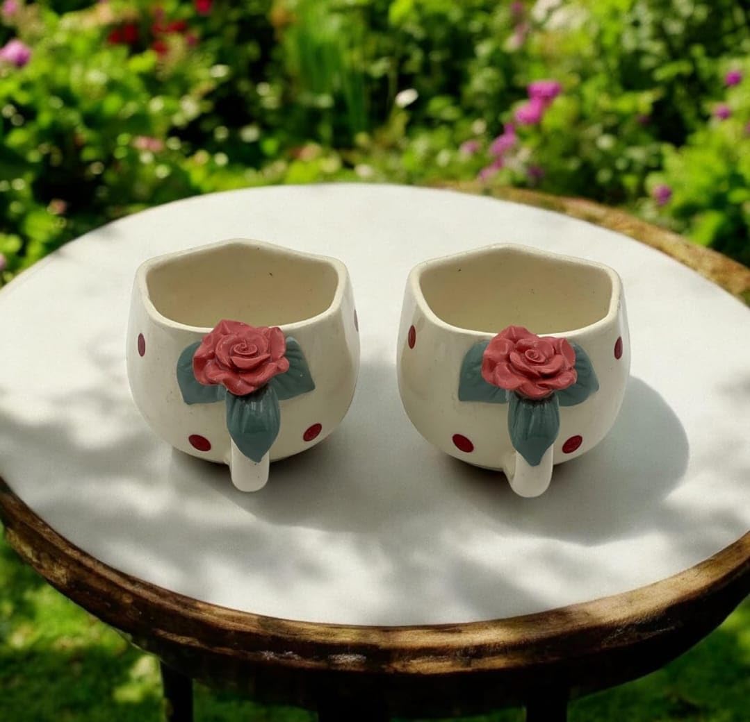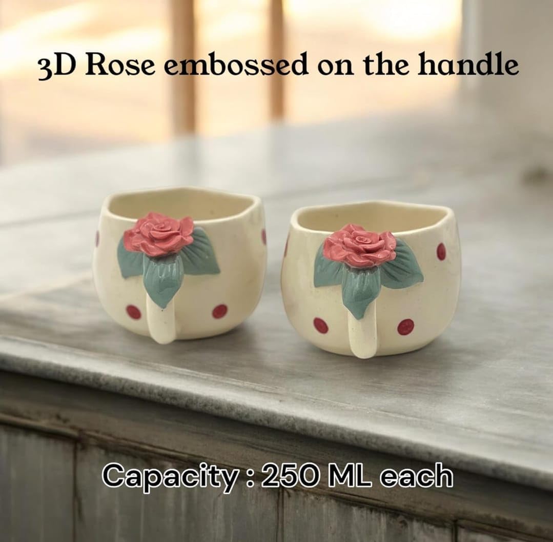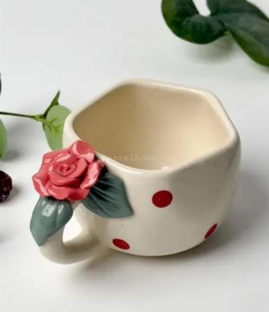 Lovingly handmade by skilled Indian artisans, this mug features a 3D sculpted rose handle paired with a charming red polka-dot design on a cream base β a perfect blend of artistry and coziness.