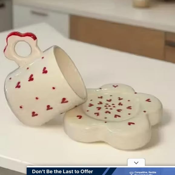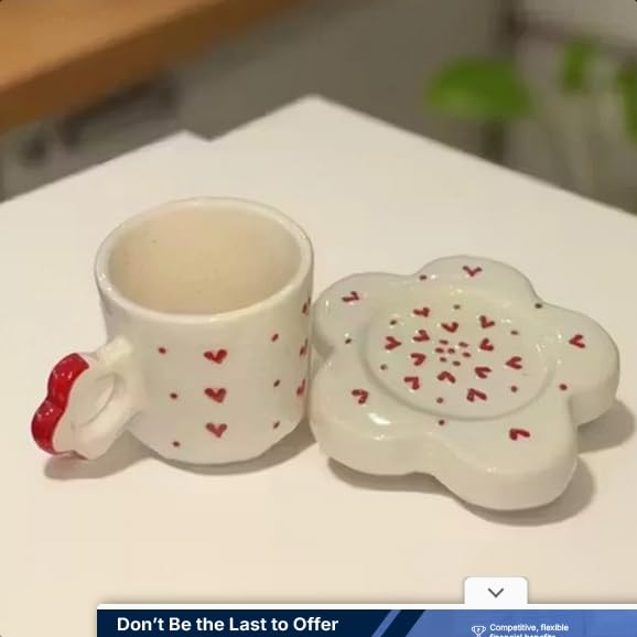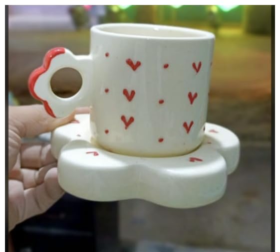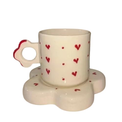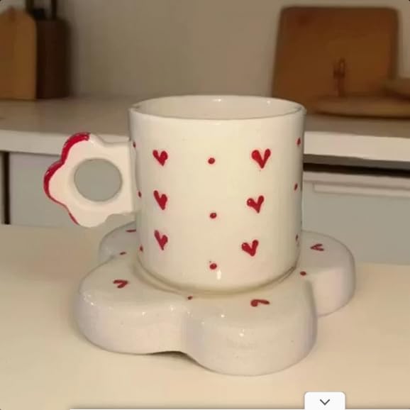 Sip your favorite tea or coffee in pure charm with this Handmade Romantic Ceramic Mug, beautifully crafted with a red heart pattern and paired with a flower-shaped saucer.