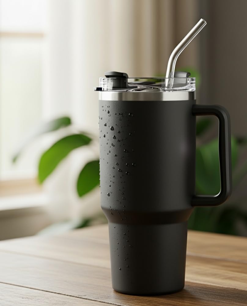 Equipped with a comfortable ergonomic handle, a spill-resistant lid, and a reusable straw, this tumbler is thoughtfully designed for convenience, durability, and all-day hydration.