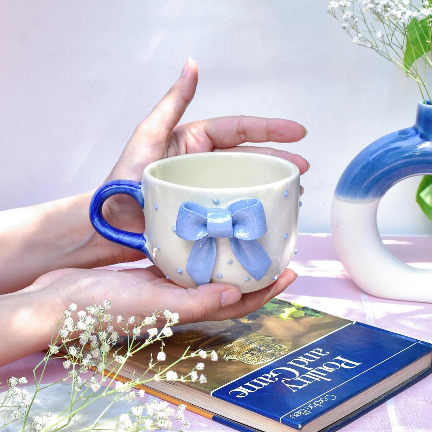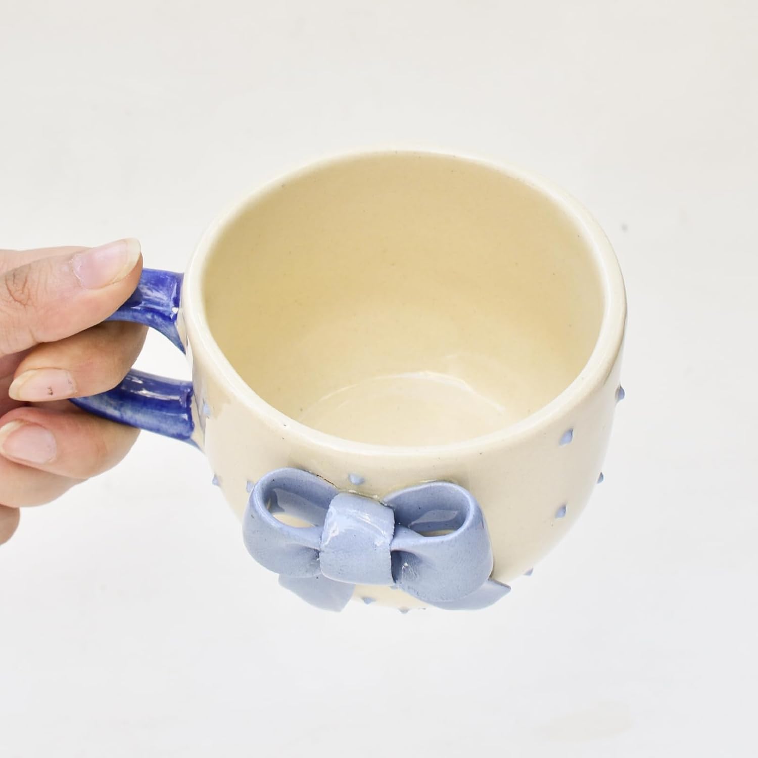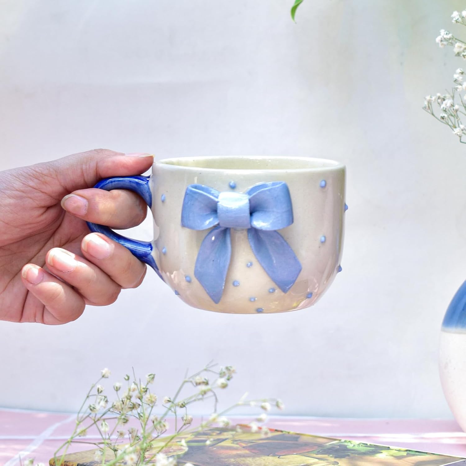 This beautifully handcrafted mug features a soft cream base, delicate embossed blue polka dots, and a stunning 3D blue bow design that instantly elevates its style. The unique ribbon-bow detailing gives it a cute, premium, and gift-worthy appealβ€”perfect for tea, coffee, milk, hot chocolate, and more.