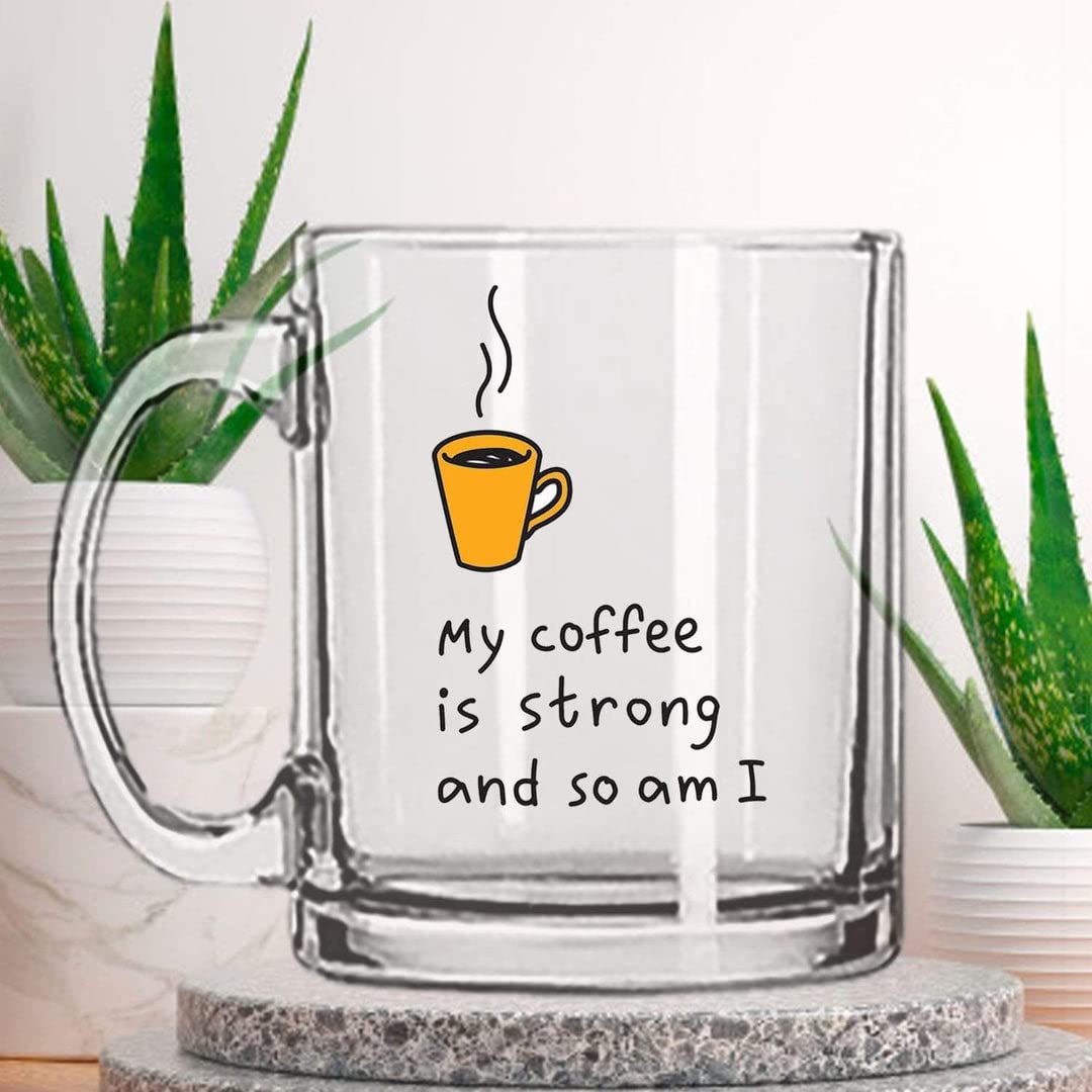 “My Coffee is Strong So Am I” ☕ Transparent Glass Mug | Motivational Quote Coffee Cup | Stylish Gift for Men & Women | 300ml