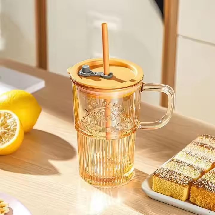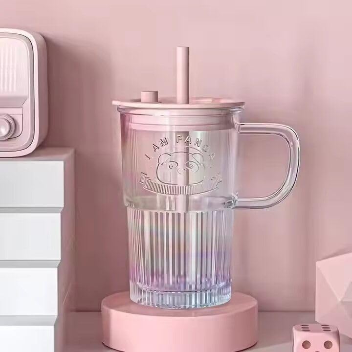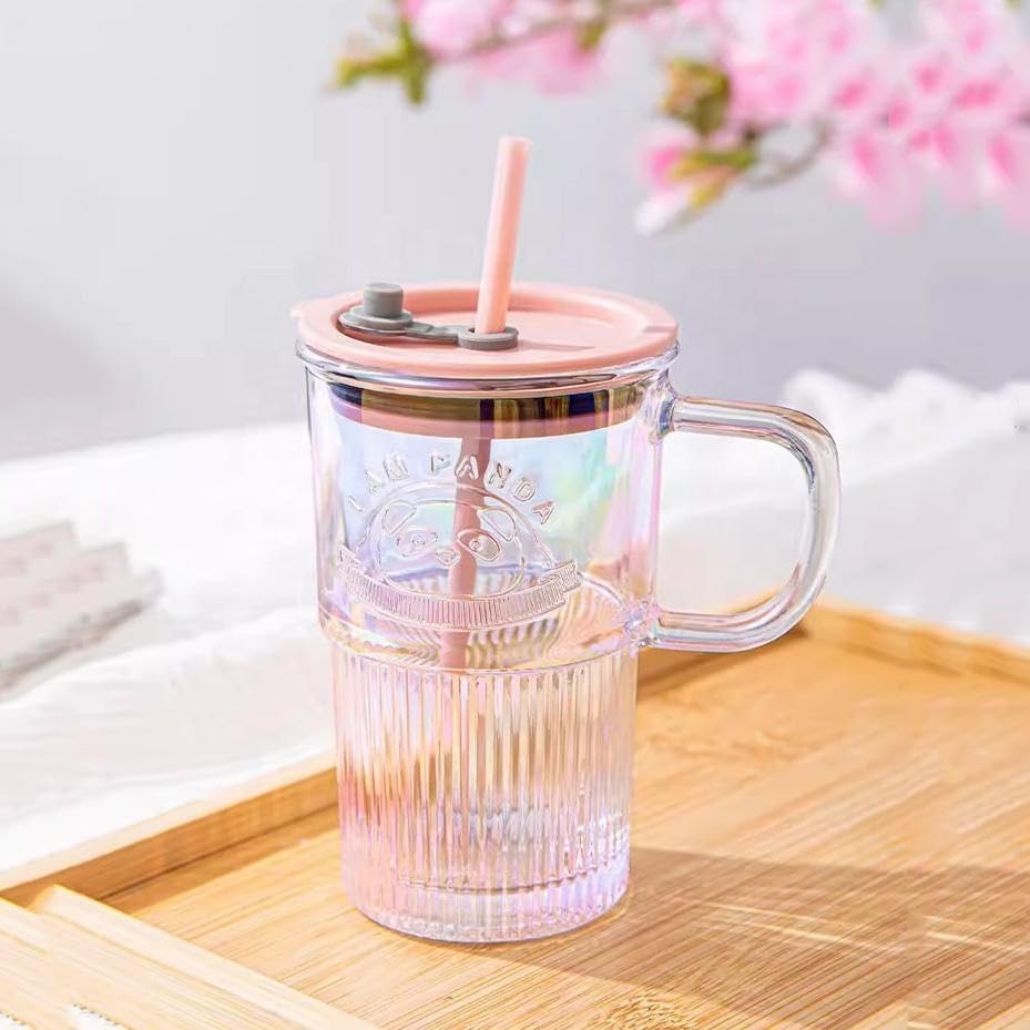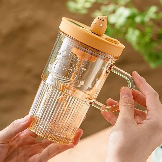 The mug features a cute panda emboss, a colorful random finish, and comes with a spill-proof lid and reusable straw, making it ideal for parties, home, office, or kids’ drinks. Its comfortable handle ensures easy grip, while the durable glass body is both eco-friendly and safe 🌿✨.