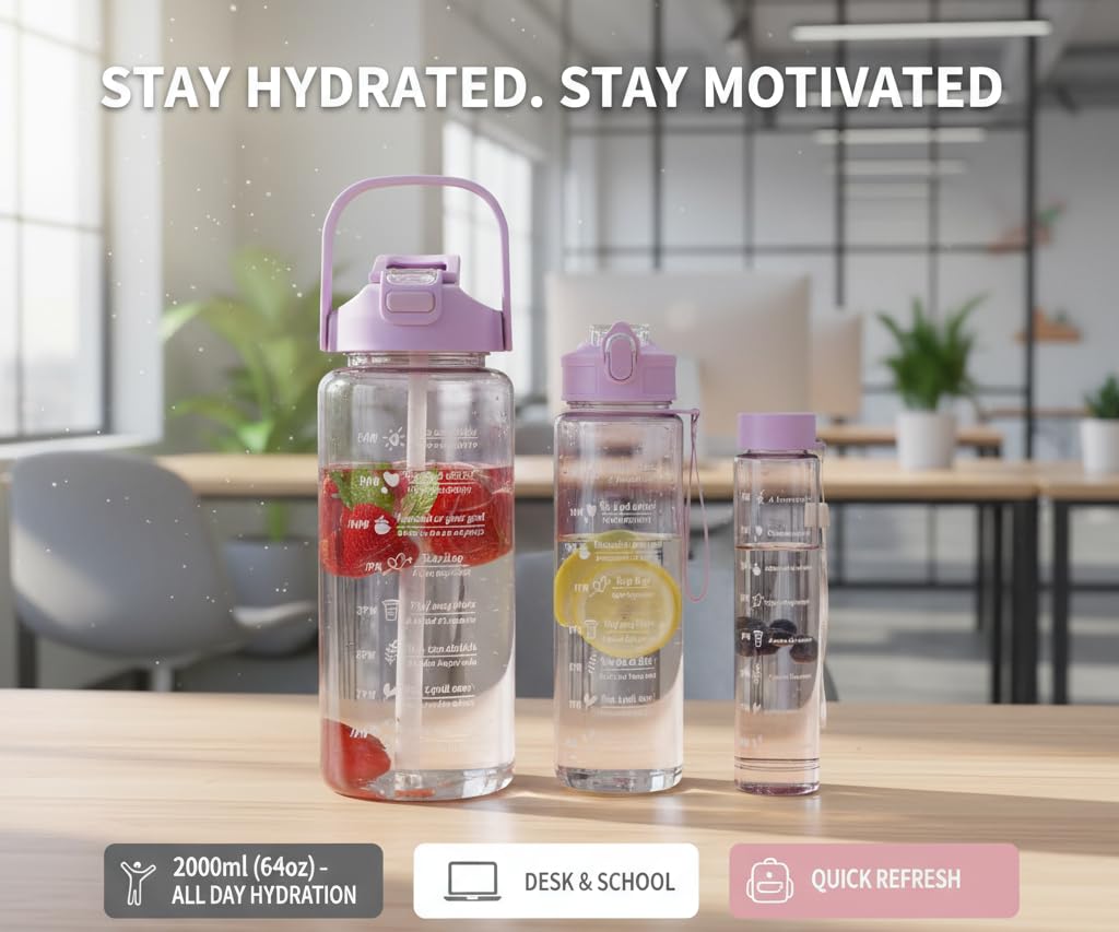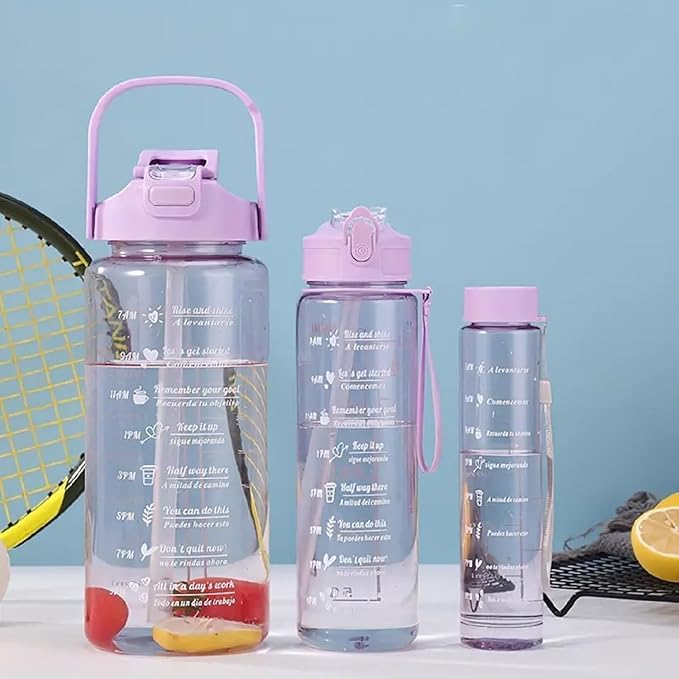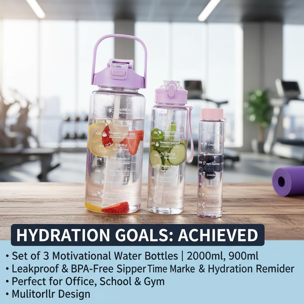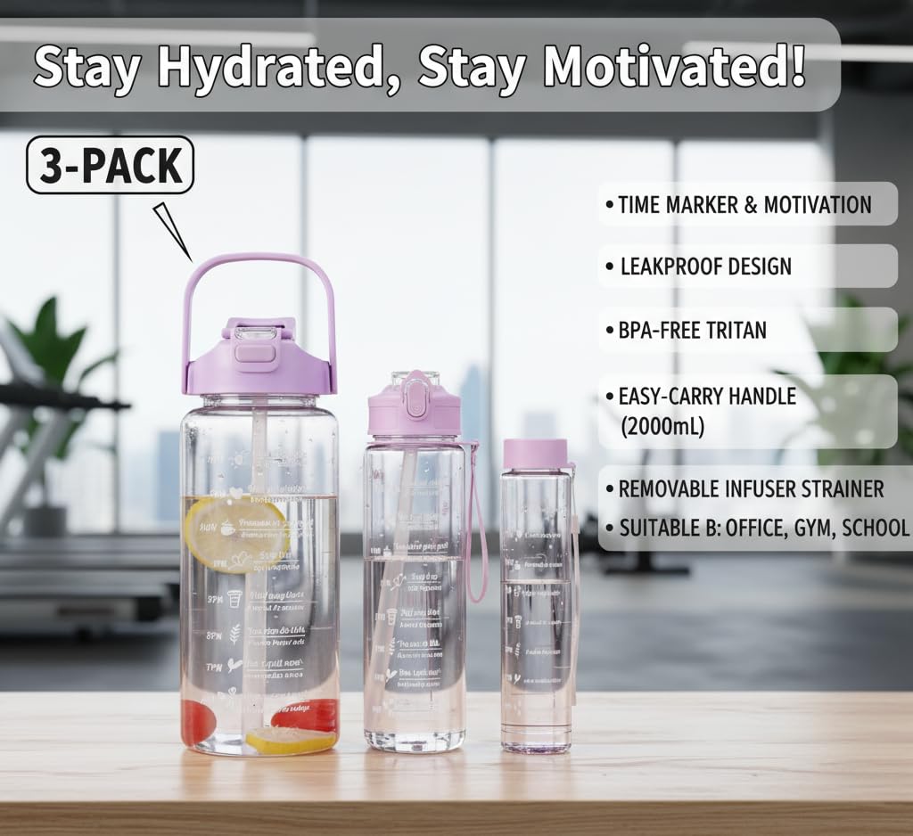 Stay hydrated and motivated throughout the day with this Pack of 3 Transparent Motivational Water Bottles ๐งโจ. Each bottle comes with time markers, helping you track your daily water intake and stay on top of your fitness goals.